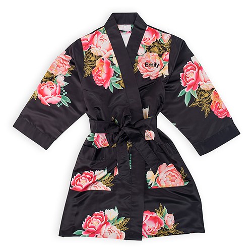 The black bold and vibrant colors of coral, cream and green of the Black Floral Personalized Woman's Silky Kimono Robe feature... Read more